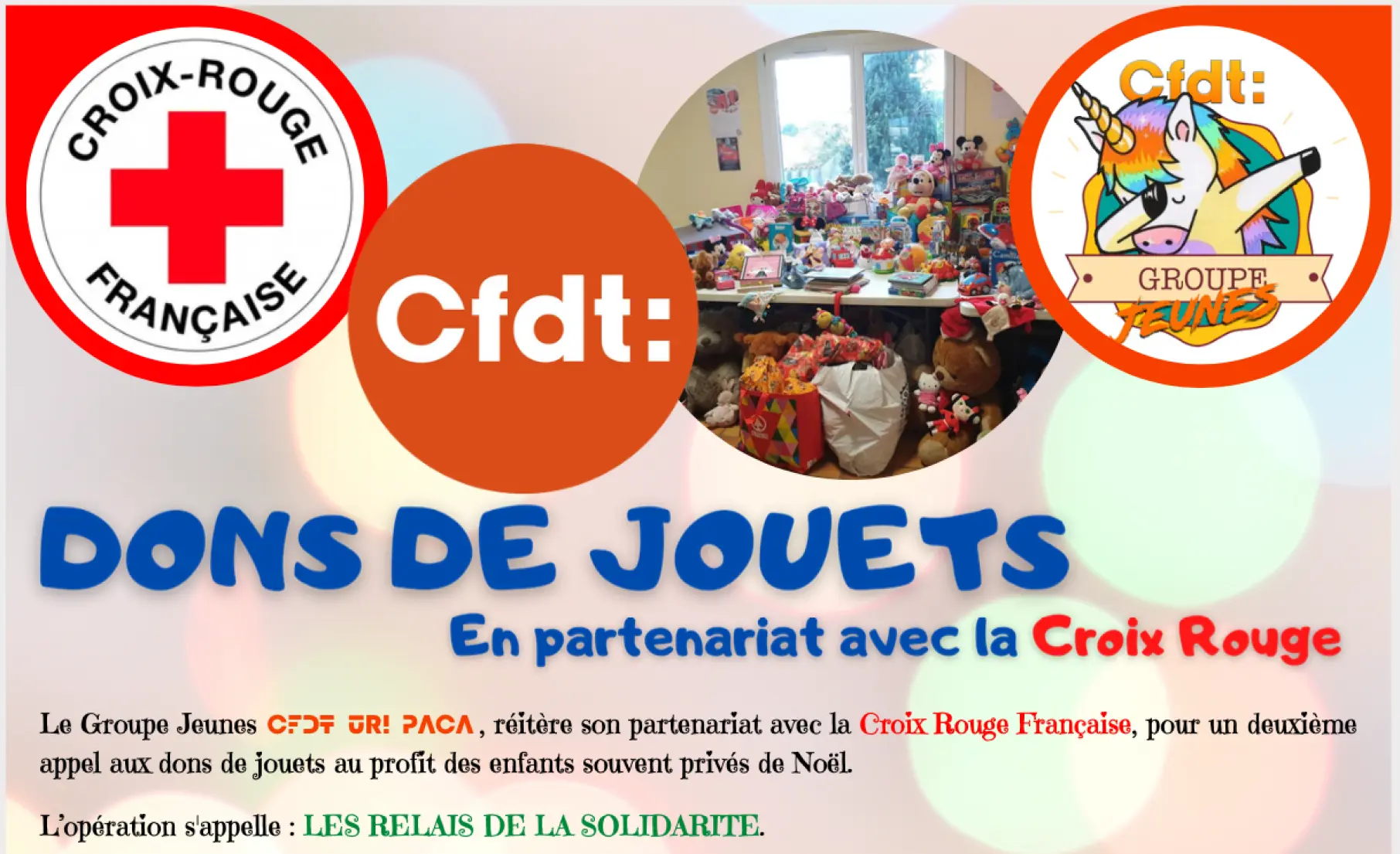 Le Groupe Jeunes CFDT URI PACA , réitère son partenariat avec la Croix Rouge Française, pour un deuxième appel aux dons de jouets au profit des enfants souvent privés de Noël. L’opération s'appelle : LES RELAIS DE LA SOLIDARITE.