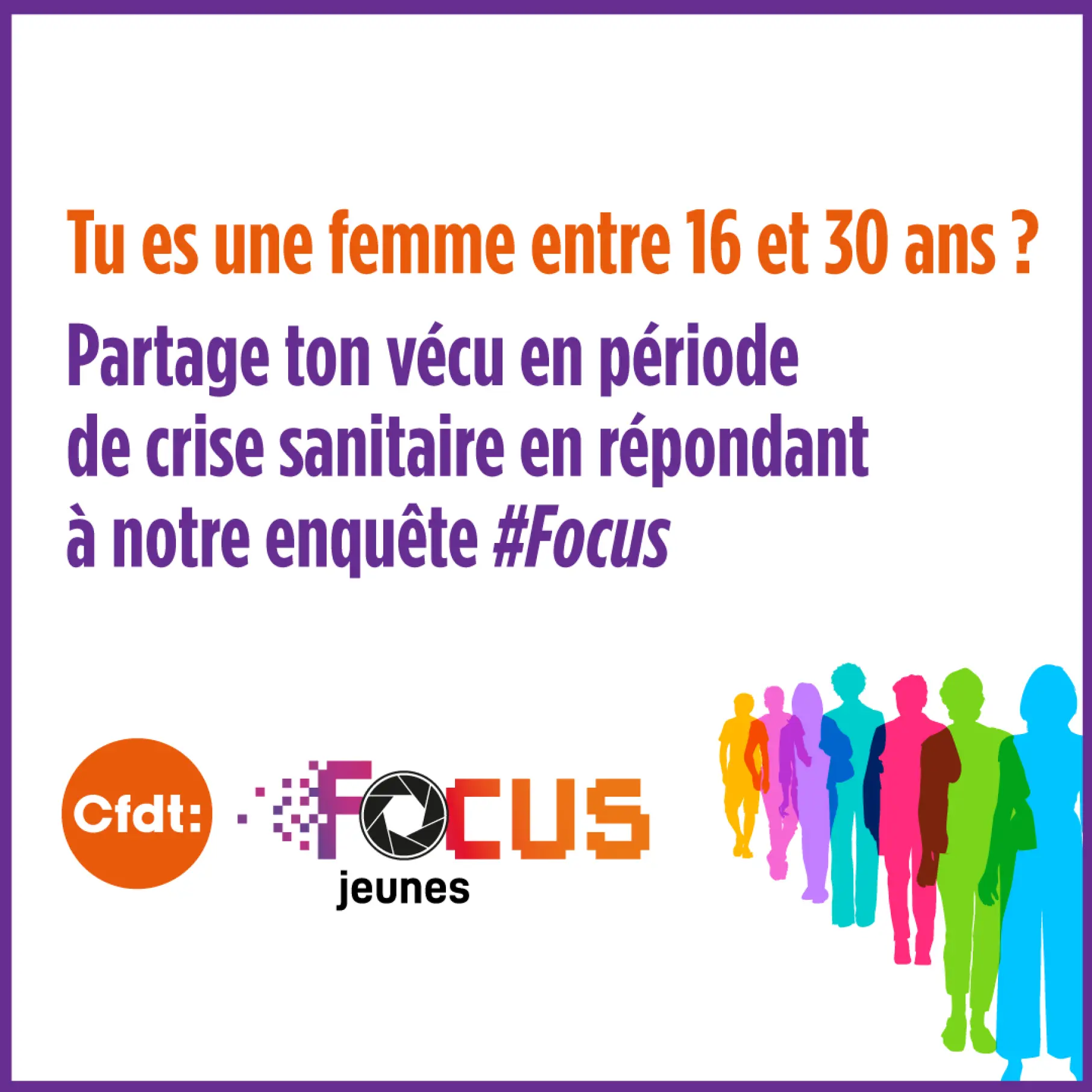 Du 18 octobre au 21 novembre 2021, la CFDT lance une nouvelle enquête centrée sur la situation des jeunes femmes (cis, trans) à la sortie de la crise sanitaire. Si vous êtes une jeune femme entre 16 à 30 ans, répondez à notre enquête CFDT ! Cela ne vous prendra que quelques minutes et nous permettra d'entendre ce que vous avez à nous dire. C’est parce que nous connaitrons mieux votre situation en tant que jeune et en tant que femme que nous pourrons enrichir nos revendications et propositions, et ainsi mieux vous représenter, vous accompagner, vous apporter les bonnes réponses.