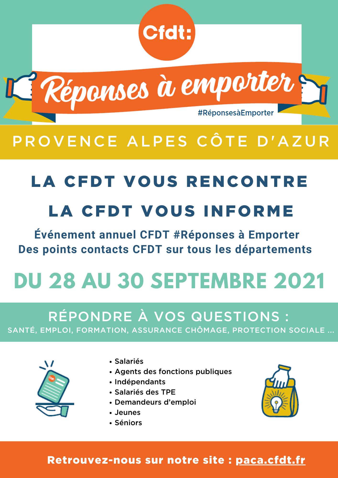 Du 28 au 30 Septembre 2021, la CFDT PACA sera présente sur 27 lieux à la rencontre et disposition des salariés de petites, grandes entreprises, des travailleurs indépendants, salariés du particulier employeur.