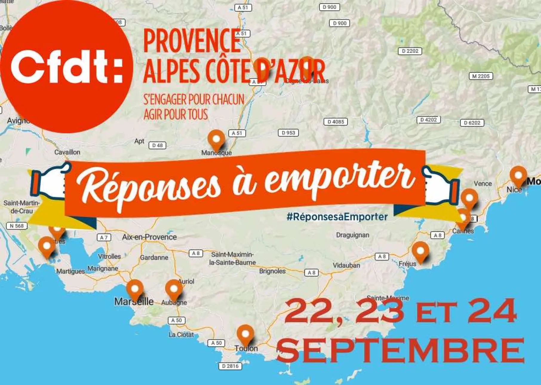 Du 22 au 24 septembre, la CFDT organise son opération de rentrée à travers des centaines de points contact sur tout le territoire. Sur la région Provence Alpes Côte d’azur, cette initiative se décline avec des dizaines de points d’accueils organisés au plus proche des travailleurs, dans les locaux CFDT interprofessionnels (Unions Interprofessionnelles de proximité, Unions départementales, ...) ou directement dans les bassins d’emplois (CFDT Mobile, Barnum CFDT, ...).