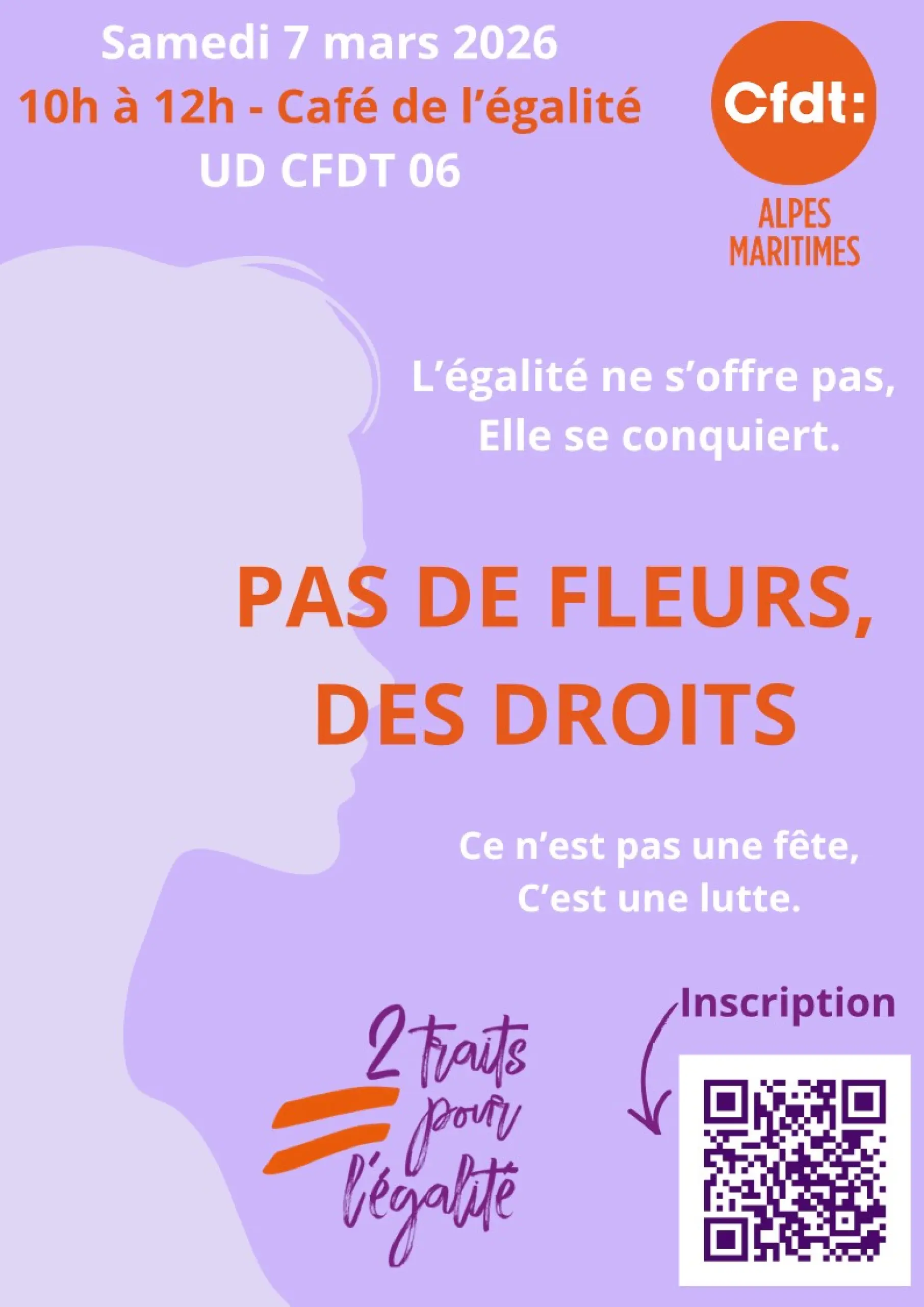 Dans le cadre de la Journée Internationale des Droits des Femmes, l’UD CFDT 06 organise une action le samedi 7 mars 2026 de 10h à 12h, en salle 4 au sous-sol dans nos locaux situé au 12 Bd DELFINO – NICE, autour d’un « Café de l’égalité »