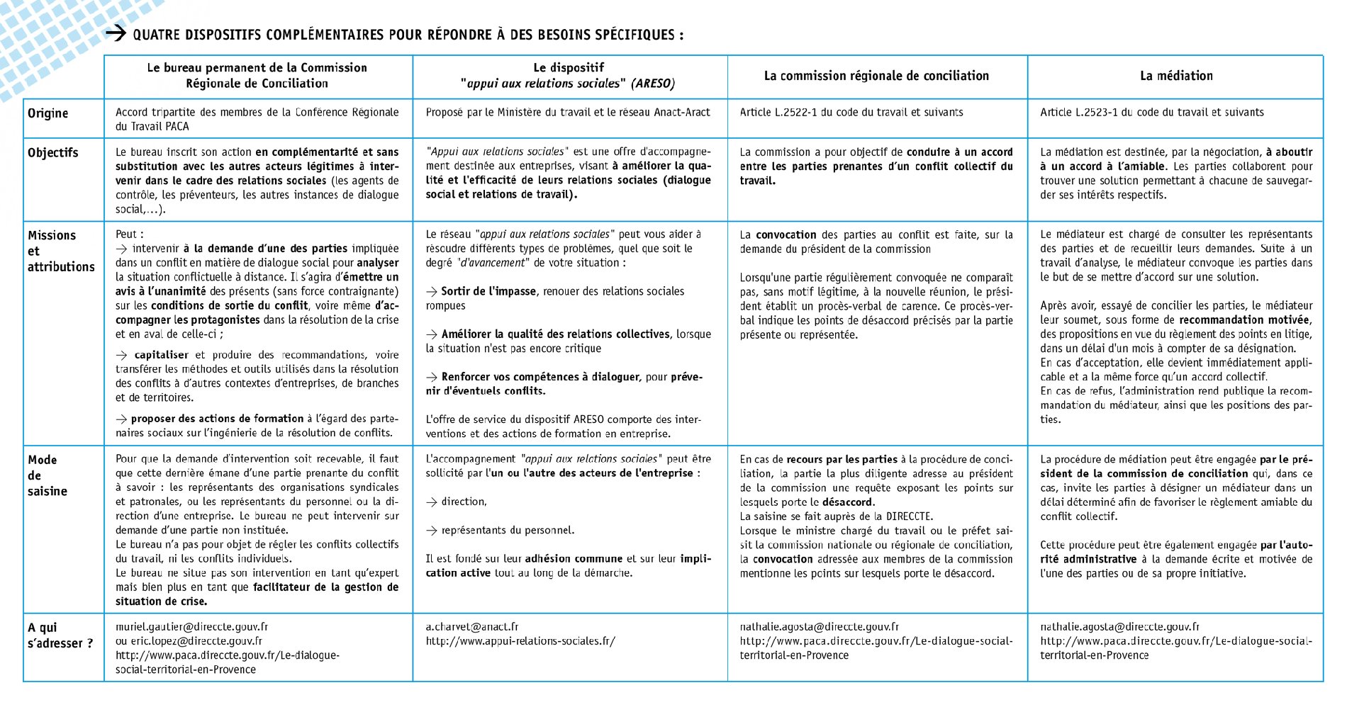 Quatre dispositifs complémentaires sont au service des salariés des entreprises et des employeu rs de PACA pour les accompagner en cas de situation de conflits. Ils vous sont présentés ici afin de faciliter leur mobilisation.